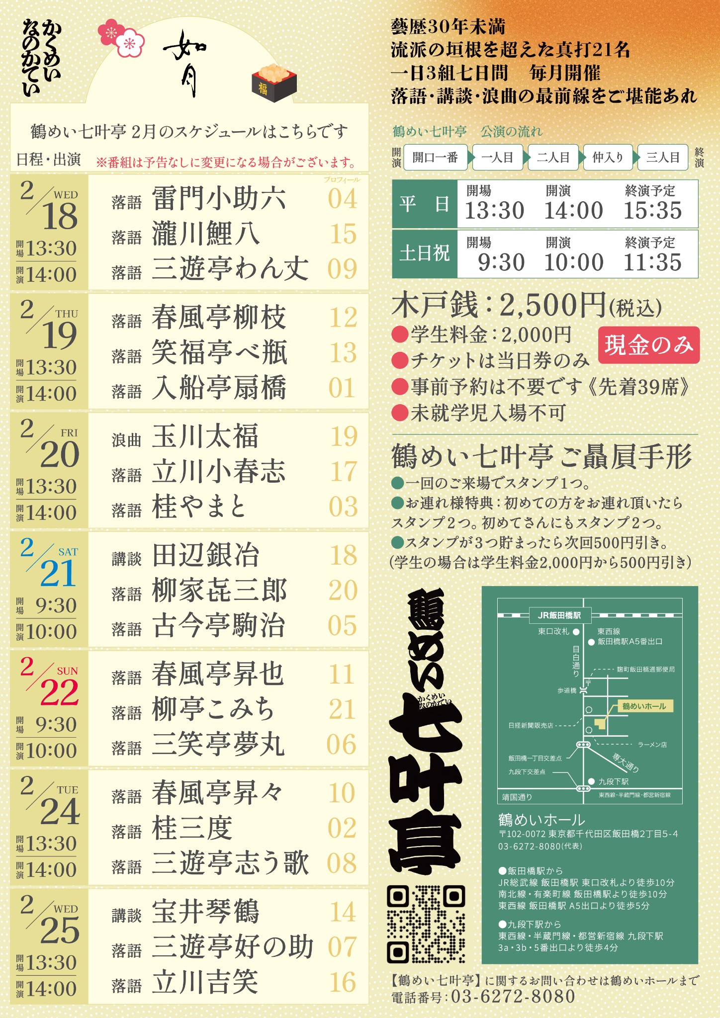 東京 2026.02.18(水) 鶴めい七叶亭(如月) ◆開演:14:00 / 開場:13:30 ◆会場:鶴めいホール(東京都千代田区飯田橋2-5-4) ◆出演:雷門小助六・瀧川鯉八・三遊亭わん丈 ◆木戸銭:2,500円(税込) / 学生料金 2,000円 ※チケットは当日券のみ ◆お問い合わせ:鶴めいホール TEL 03-6272-8080(詳細)